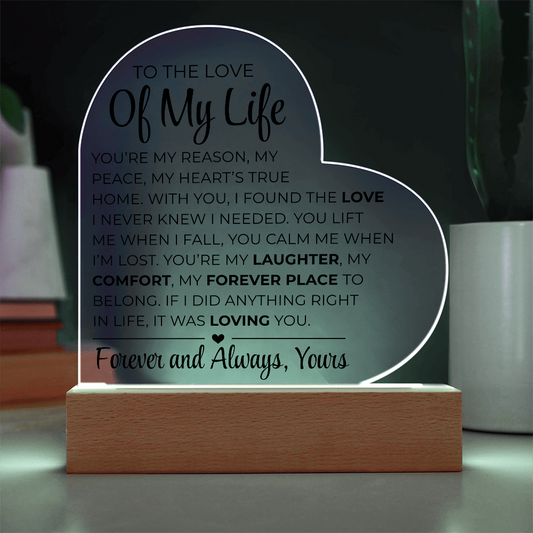 An die Liebe meines Lebens – Acrylplakette mit gedrucktem Herz